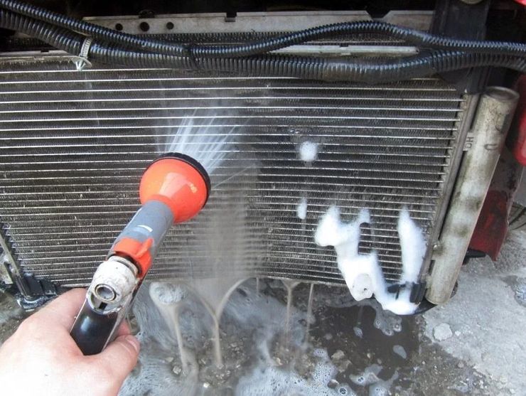 Зовнішнє миття: Це включає промивання зовнішньої частини радіатора від забруднень. Найпростіший спосіб — використання води під тиском, але не надто сильного, щоб не пошкодити тонкі трубки радіатора. Деякі спеціалісти рекомендують використовувати спеціальні засоби для очищення радіатора, які допоможуть розм’якшити і видалити бруд.